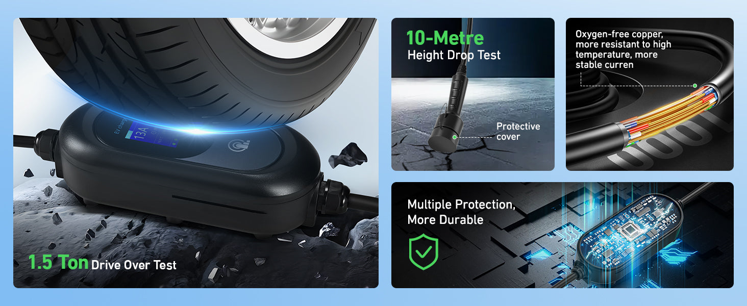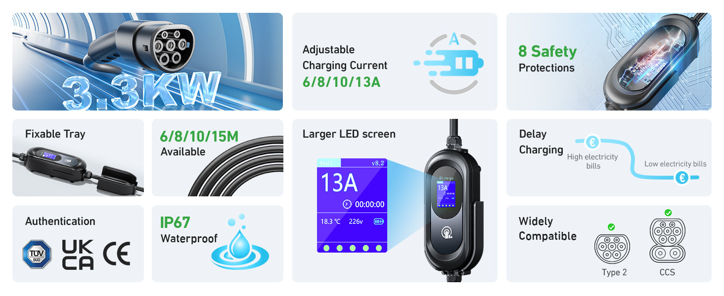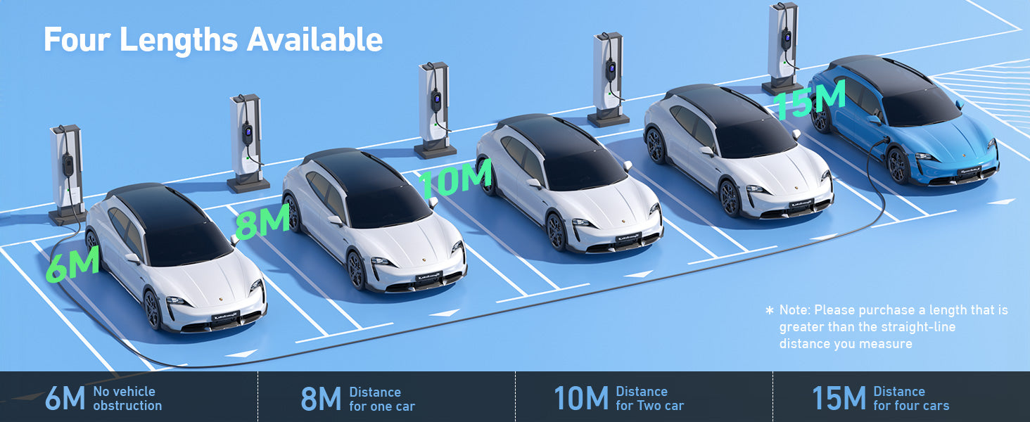 | Note: We provide you 2 Years Premium Guarante, and life-long technical support. Please refer to the cable length parameter to choose the size that best meets your needs. Due to battery limitations in some car models and possible fluctuations in the power grid environment, the actual charging power may sometimes be less than 2.3kW. |